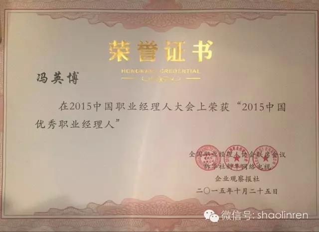 作为泉州市职业经理人协会常务理事、少林企业总部综合管理部经理,冯英博先生与其他各界职业经理人精英一道积极参与盛会。值得庆贺的是,在本次大会的颁奖典礼上,他荣获“2015中国优秀职业经理人”的殊荣。